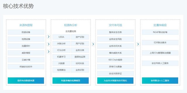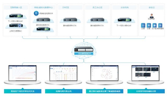 深信服安全感知平台定位为客户的安全大脑,是一个检测、预警、响应处置的大数据安全分析平台。其以全流量分析为核心,结合威胁情报、行为分析建模、UEBA、失陷主机检测、图关联分析、机器学习、大数据关联分析、可视化等技术,对全网流量实现全网业务可视化、威胁可视化、攻击与可疑流量可视化等,帮助客户在高级威胁入侵之后,损失发生之前及时发现威胁。