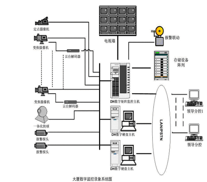⑴电视监控:对人员进出通道、停车场、大堂及办公层通道、电梯、电梯厅、重要场所等实现图像监控,进行有效监视和记录。矩阵控制主机采用知名品牌ADl68矩阵,具有双CPU及模块化组合式结构,并考虑了系统的扩展。采用一体化的嵌入式硬盘录像机,克服了一般基于PC或工控机的硬盘录像机会产生黑屏、死机等不稳定现象。更重要的是真正的双工操作,意味着无论操作者进行什么操作,录像永远不会中断。