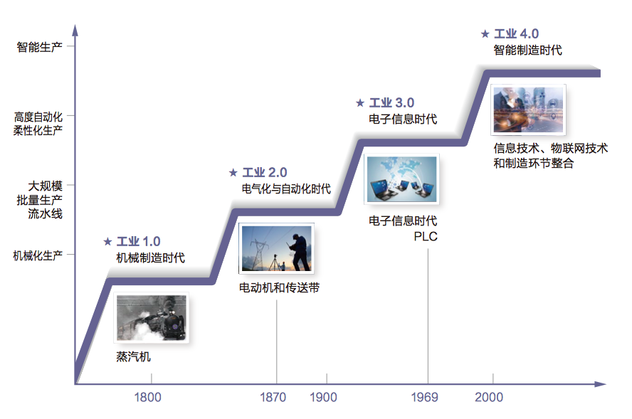 回顾工业发展史,自从250年以前英国发生了第一次工业革命以来,人类社会已经经历了三次工业革命,目前正在第四次工业革命的道路上。按照德国工业4.0的定义,前三次工业革命分别为工业1.0、2.0、3.0,其核心技术特征分别是机械化、自动化和信息化。工业4.0是德国2013年确定的十大未来项目之一,是实体物理世界与虚拟网络世界融合的一种新的产品和新服务的生产模式,一般认为其设计雏形是智能工厂。