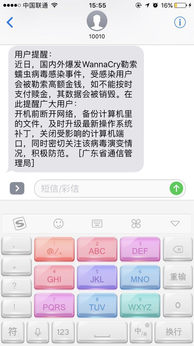 这种病毒会呈现什么样的特征呢,此次病毒会将系统上的大量文件加密成为.onion为后缀的文件,如果要解密,则需要缴纳价值300美元的比特币。这是一种非常恶心的病毒,这种勒索病毒使用的是2048位RSA加密,目前的计算机没有办法解密,暴力破解的时间可能要以百万年计或是等到量子计算机实用化。除了支付价格不菲的特币,而且黑客还不一定给你解密,总之这样的勒索病毒不要太恶心。而且这次病毒的肆虐,全球都引起了关注,这不,中国联通都发来了温馨短信。
