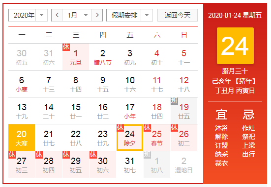 1月24日(星期五、农历除夕)至1月30日(星期四)休假,共7天,1月31日(星期五),2月1日(星期六)正常上班