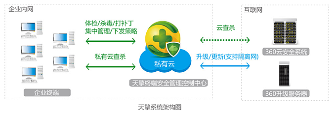 360天擎终端安全管系统是360面向政府、企业、金融、军队、医疗、教育、制造业等大型企事业单位推出的集防病毒与终端安全管控于一体的解决方案。360天擎终端安全管理系统,以大数据技术为支撑、以可靠服务为保障,它能够为用户精确检测已知病毒木马、未知恶意代码,有效防御APT攻击,并提供终端资产管理、漏洞补丁管理、安全运维管控、网络安全准入、移动存储管理、终端安全审计、XP盾甲防护诸多功能。