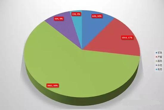 2017上半年年共发布整理5966条漏洞信息(数据截止至2017.06/30)其中紧急级别漏洞数量为620个 严重级别漏洞为1014个 高危级别漏洞3602个 中危漏洞1504个 低危漏洞226个.