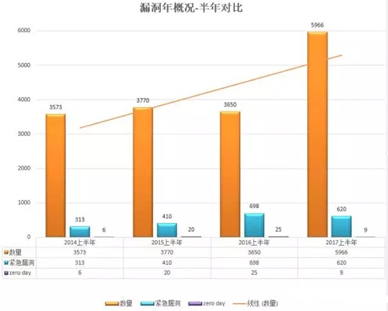 2015上半年共收录3770个漏洞,其中紧急漏洞数量为410个,而2016上半年为3650个漏洞,其中紧急漏洞数量为698个,而2017上半年竟达5966个漏洞,其中紧急漏洞数量为628个。