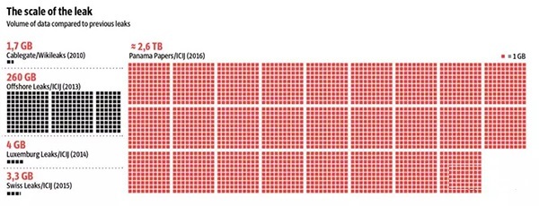 Panama Papers披露的泄密数据比维基解密、离岸解密(Offshore Leaks)、 Lux Leaks和Swiss Leaks这几个解密网站披露的数据总和还要多。因此,该事件位居数据泄露规模榜“榜首”。