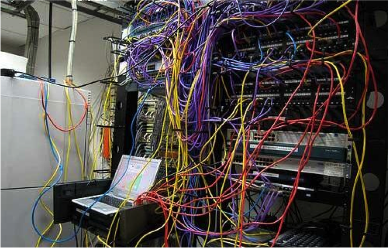 当然这种悲剧的情况毕竟要在这样悲剧的机房里才容易发生,许多IT工作者如同蜘蛛织网肥蚕结茧一样,专心致志一丝不苟百折不挠地护理着自己的机房小窝,强迫症+处女座爆发,将网线机架部得毫无人工雕琢的痕迹。然而虽然机房干净了,原来的问题依然没有得到解决,整个网络拓扑也变得隐晦难明,工作交接时更是焦头烂额,老人痛,新人哭,一个字形容——复杂!难搞!