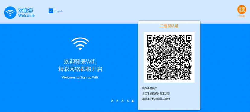 内部员工采用802.1X认证方式接入内网,保障网络接入安全;外部访客采用二维码审核认证的方式接入网络,做到规范上网;会议室访客采用扫描二维码的方式,即墙上贴有上网用二维码,访客扫码即可上网。
