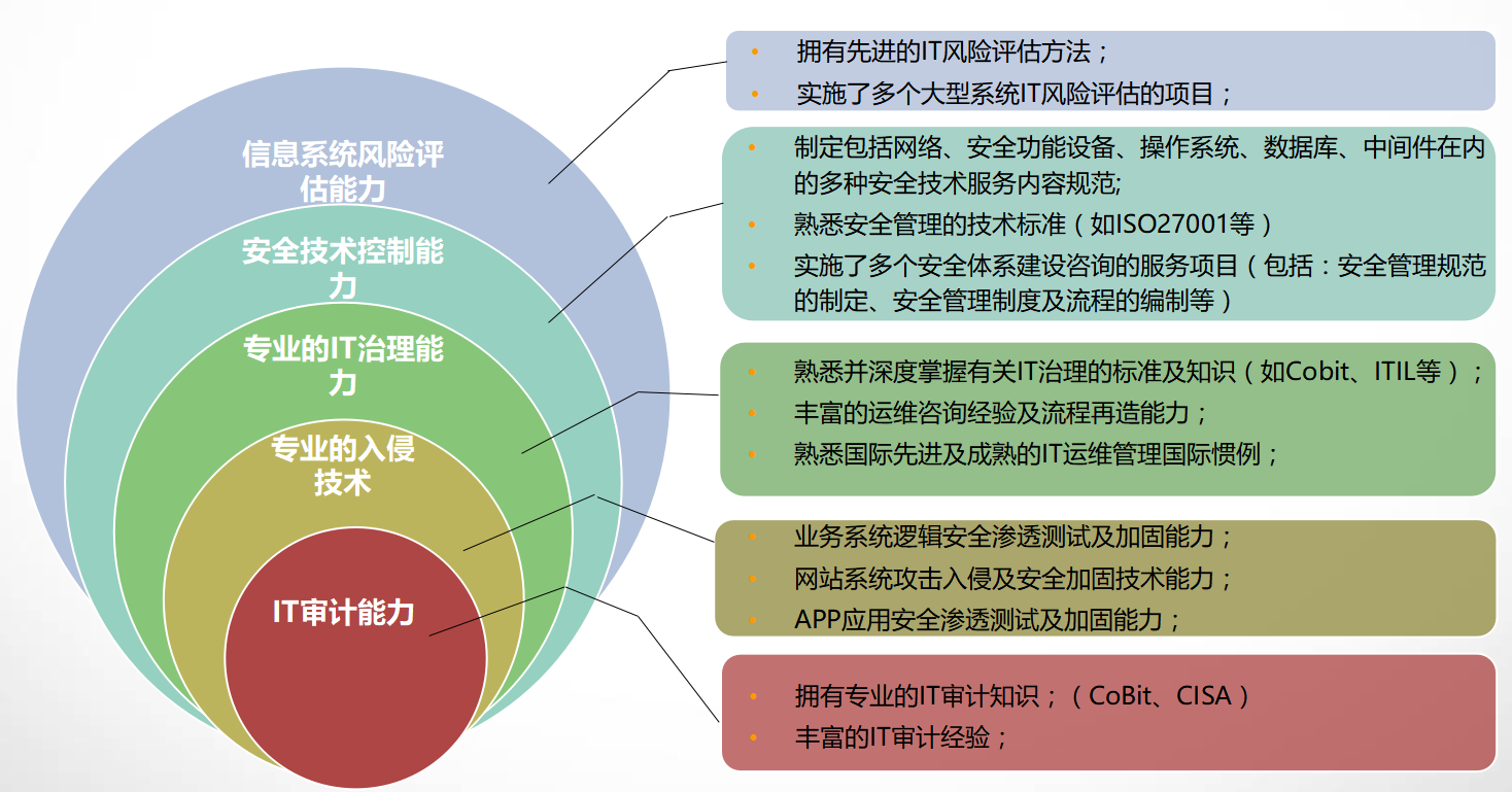 通过工具及人工检测的方式,对系统中网络设备、操作系统、数据库和应用服务器的配置进行安全检查,提供安全配置评估报告和改进建议。