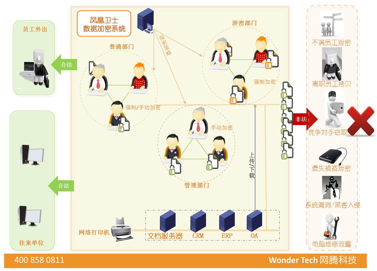 Wonder Tech根据企业级用户的实际需求,研发了以先进的PHOENIX加密技术为核心的,集身份认证与权限管理、自动备份、U盘管控、程序控制、日志记录、截屏监控、远程通讯等多功能模块于一体的反商业泄密系统软件,是解决企业信息安全泄密问题的最优方案。